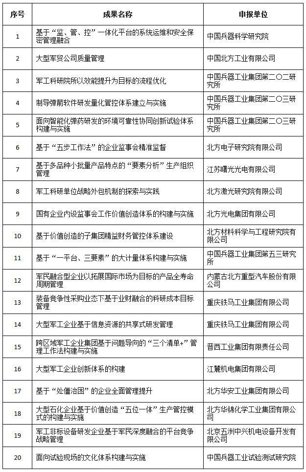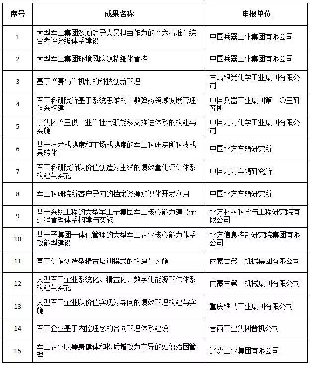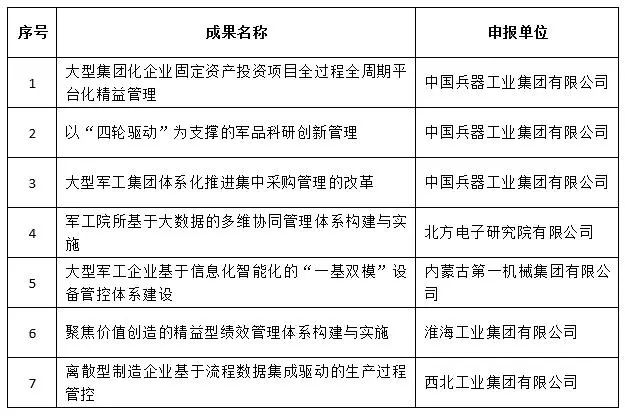 經(jīng)全國(guó)企業(yè)管理現(xiàn)代化創(chuàng)新成果審定委員會(huì)終審,第二十五屆全國(guó)企業(yè)管理現(xiàn)代化創(chuàng)新成果公布,中國(guó)兵器工業(yè)集團(tuán)4項(xiàng)創(chuàng)新成果榮獲二等獎(jiǎng)。