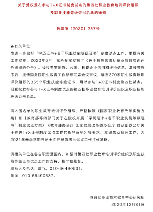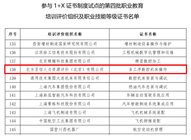 近日,教育部發(fā)布《關(guān)于受權(quán)發(fā)布參與1+X證書制度試點(diǎn)的第四批職業(yè)教育培訓(xùn)評價組織及職業(yè)技能等級證書名單的通知》,中國兵器工業(yè)集團(tuán)北方至信人力資源評價(北京)有限公司獲得“多工序數(shù)控機(jī)床操作”在全國職業(yè)院校的培訓(xùn)、認(rèn)定和發(fā)證權(quán)。