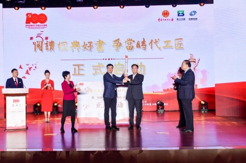 第五屆“閱讀經(jīng)典好書 爭當(dāng)時代工匠”全國工會職工書屋主題閱讀交流活動正式啟動,現(xiàn)場進行火炬?zhèn)魇?/p>