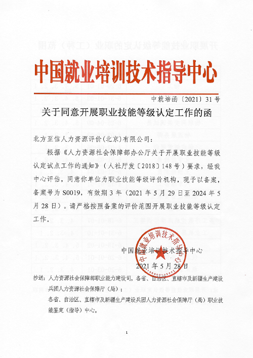 5月28日,人力資源社會保障部中國就業(yè)培訓(xùn)技術(shù)指導(dǎo)中心發(fā)布了《關(guān)于同意開展職業(yè)技能等級認(rèn)定工作的函》(中就培函〔2021〕31號),北方至信人力資源評價(北京)有限公司(以下簡稱“北方至信”)成為首家央企全國性社會培訓(xùn)評價組織職業(yè)技能等級認(rèn)定機(jī)構(gòu)。