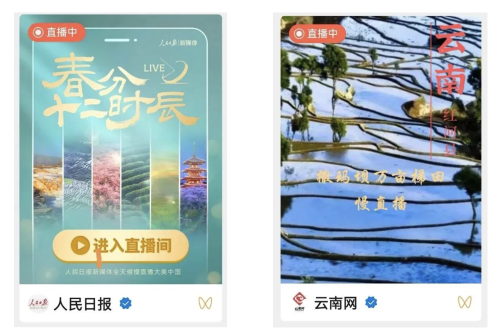 3月20日為農(nóng)歷二十四節(jié)氣的春分,在中國(guó)兵器工業(yè)集團(tuán)有限公司的助力下,人民日?qǐng)?bào)、云南網(wǎng)等主流媒體再次聚焦紅河縣撒瑪壩萬(wàn)畝梯田,人民日?qǐng)?bào)新媒體平臺(tái)策劃推出“春分十二時(shí)辰”直播活動(dòng),通過鏡頭展示祖國(guó)各地春分時(shí)節(jié)壯美的自然風(fēng)光。其中,人民日?qǐng)?bào)視頻號(hào)和云南網(wǎng)視頻號(hào)在中午時(shí)段的直播中,紅河縣撒瑪壩萬(wàn)畝梯田出現(xiàn)在觀眾的視野里,贏得了數(shù)十萬(wàn)觀眾的點(diǎn)贊,產(chǎn)生了良好的社會(huì)效應(yīng)。