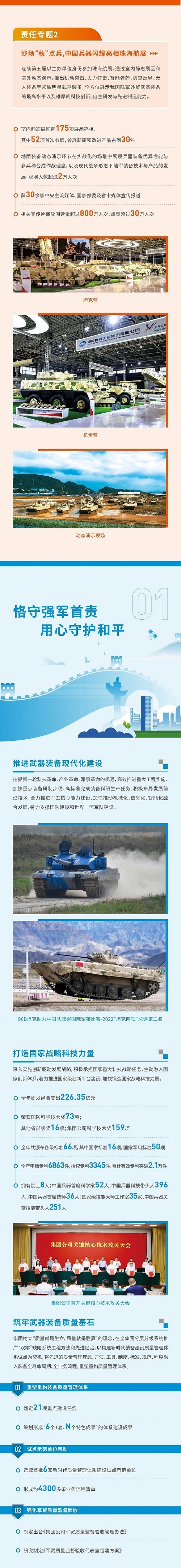 《報(bào)告》開篇設(shè)置“突出政治引領(lǐng),全面加強(qiáng)黨的領(lǐng)導(dǎo)黨的建設(shè)”“沙場(chǎng)‘秋’點(diǎn)兵,中國兵器閃耀亮相珠海航展”兩個(gè)責(zé)任專題,聚焦集團(tuán)公司加強(qiáng)黨建、強(qiáng)軍報(bào)國的擔(dān)當(dāng)作為,書寫集團(tuán)公司在新時(shí)代新征程上的奮進(jìn)答卷。主體章節(jié)以“用心守護(hù)和平、用力爭(zhēng)創(chuàng)一流、用情溫暖社會(huì)”為主題,從恪守強(qiáng)軍首責(zé)、服務(wù)經(jīng)濟(jì)建設(shè)、共創(chuàng)美好生活三個(gè)維度展現(xiàn)了集團(tuán)公司立足“1+5”戰(zhàn)略和“雙十”規(guī)劃,聚焦新時(shí)代新征程新任務(wù)高質(zhì)量履行政治責(zé)任、經(jīng)濟(jì)責(zé)任和社會(huì)責(zé)任的具體行動(dòng)和成效亮點(diǎn),詮釋了集團(tuán)公司服務(wù)國家戰(zhàn)略、服務(wù)國防和軍隊(duì)現(xiàn)代化建設(shè)、服務(wù)國家經(jīng)濟(jì)社會(huì)發(fā)展的職責(zé)使命。